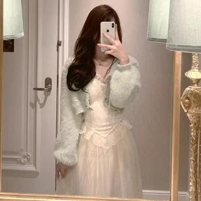 甜美套装女装温柔风小清新薄荷绿开衫毛衣蕾丝吊带背心...