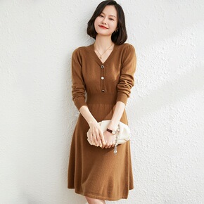 V领羊绒针织连衣裙女士秋冬季中长款修身显瘦过膝羊绒...