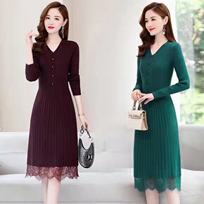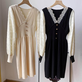 2022春秋新款配大衣针织连衣裙女时尚百搭v领蕾丝...