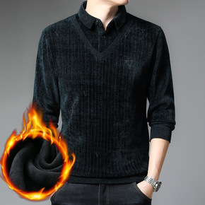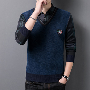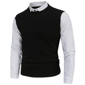 男士假两件套针织衫秋冬季个性衬衫拼接毛衣开衫韩版修...