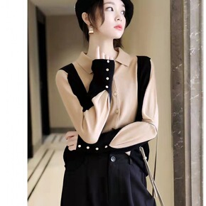 2021新款法式复古翻领软糯开衫毛衣女短款拼色针织...