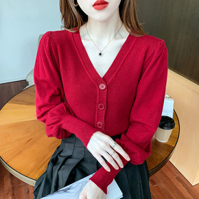 短款内搭针织衫女秋季2021新款百搭v领泡泡袖开衫...