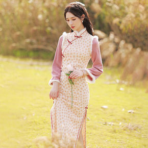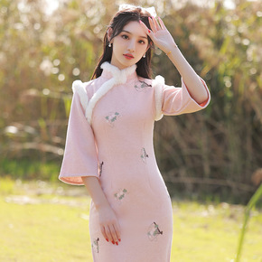 旗袍2021秋冬季新款加绒加厚改良高端粉色过年小袄...
