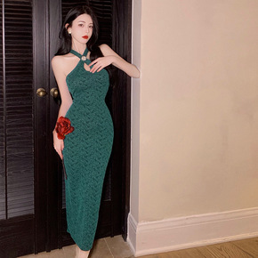 2022新款性感复古民国风露背收腰显瘦挂脖连衣裙子...