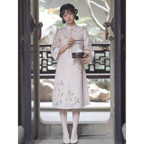 米杏色民国风秋冬七分袖女云肩刺绣旗袍改良版女...