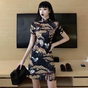 暗黑系国潮日常包臀短裙性感紧身裙改良复古民国风旗袍...