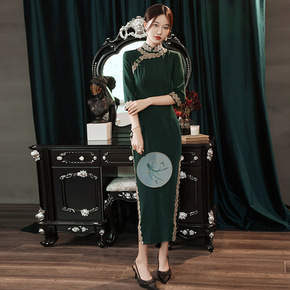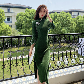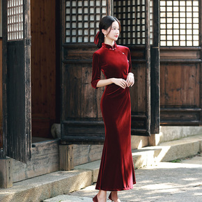 2021秋冬新款丝绒改良旗袍 长款鱼尾裙年轻款民国...