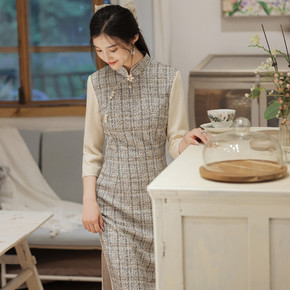改良旗袍2022秋冬新款修身短款民国复古格子小清新...