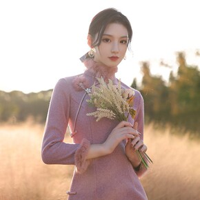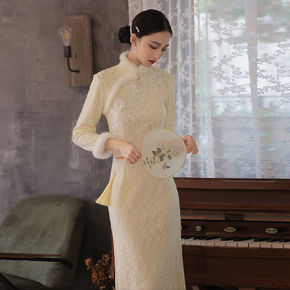 改良旗袍秋冬新款毛领少女蕾丝连衣裙日常可穿加厚保暖...