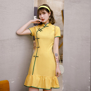 【实拍】2020春夏复古民国风少女格子旗袍裙女改良...