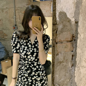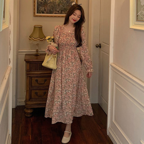 小个子方领泡泡袖连衣裙子女秋冬2021年新款法式收...