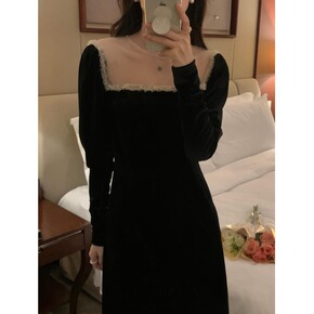 实拍2021韩版简约网纱拼接丝绒连衣裙法式复古高腰...