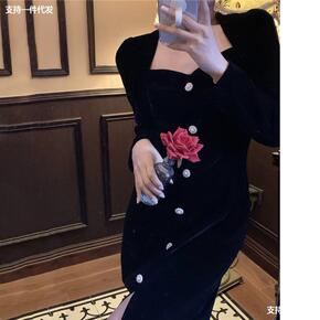 港风女套装~黑色丝绒裙子法式收腰气质女神开叉长裙复...