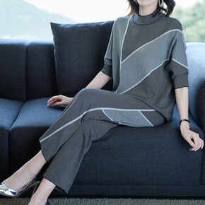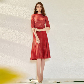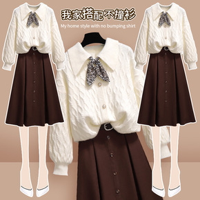 气质女神范衣服套装轻熟风 立领中袖针织衫+百褶半身...