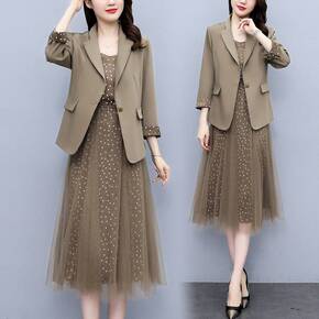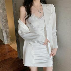 时尚气质女神范西装领长袖风衣+性感修身褶皱吊带连衣...