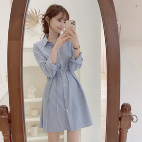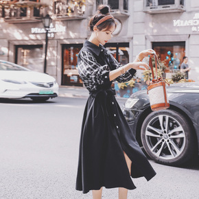 法式系带衬衫裙2022年新款春秋格纹撞色拼接设计感...