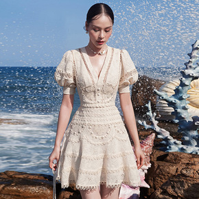越南小众设计师2022春季水溶蕾丝泡泡袖收腰法式短...