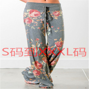 跨境亚马逊速卖通爆款欧美印花高腰系带宽松阔腿长裤休...