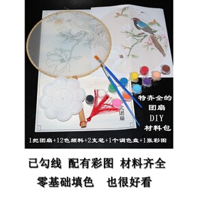 扇子团扇国画黑白线稿工笔荷花牡丹填色手绘空白DIY...