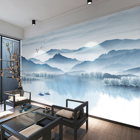 水墨山水新中式电视背景墙壁纸现代简约壁画影视墙纸客...