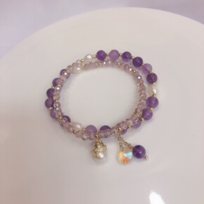 韩版新款紫水晶手链时尚个性双层设计感手串气质淡水珍...