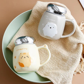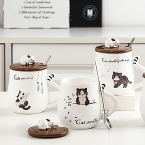 立体猫咪马克杯带盖有勺可爱陶瓷杯学生创意卡通水杯早...