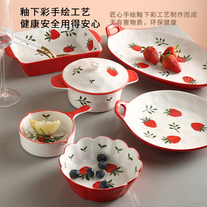 北欧手绘草莓陶瓷餐具盘碗菜盘子饭盘蒸鱼盘家用烤箱盘...