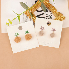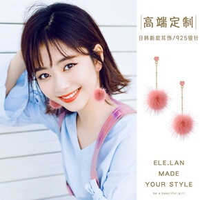925银针韩版秋冬款毛球耳环女 网红气质爱心长款水...
