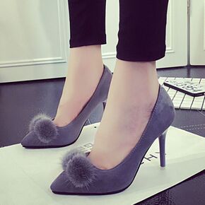 单鞋女2022春款水貂毛尖头高跟鞋细跟黑色百搭蝴蝶...