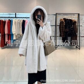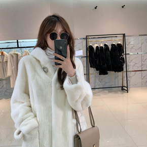 海宁新款水貂皮草女整貂中长款连帽修身款微胖貂皮大衣...