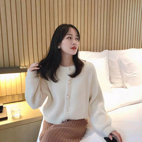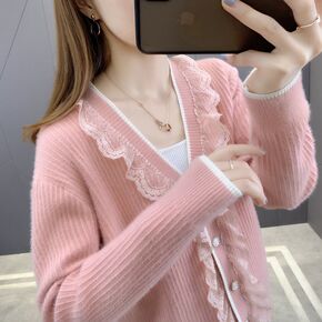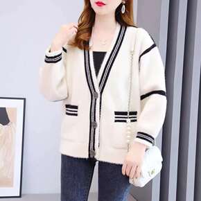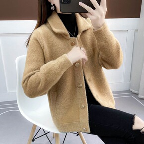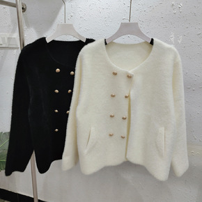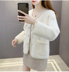 2022秋冬新款韩版水貂绒针时尚单排扣v领毛衣外套...
