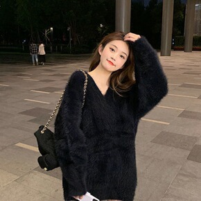 毛毛衣服女外套毛绒V领宽松水貂绒毛衣百搭黑色毛衣女...