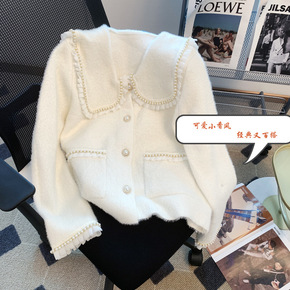 法式小香风双排扣毛衣开衫女上衣春秋白色温柔风仿水貂...