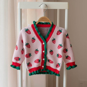 2020秋季新品女宝宝水貂绒草莓V领开衫毛衣女童甜...