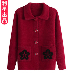 中老年女冬装翻领毛衣短外套中年妈妈款春秋装仿水貂绒...