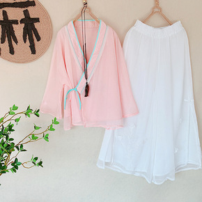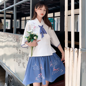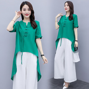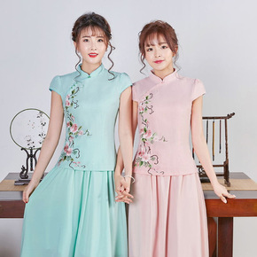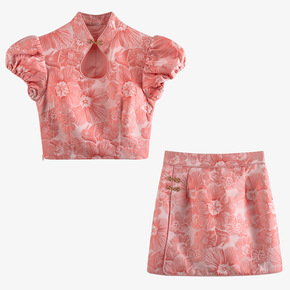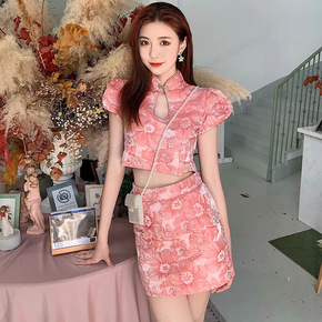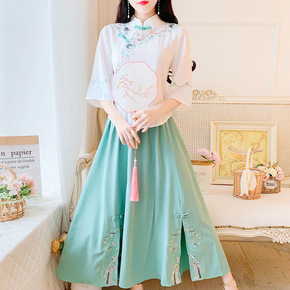 2020夏季新款气质少女改良旗袍套浮画立领上衣+半...