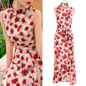 夏装2021新款时尚印花无袖上衣荷叶边气质改良版旗...