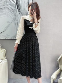 2119201-蔚蓝改良式旗袍温婉针织衫+网纱长半...