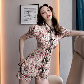 复古风改良旗袍短裤套装裙2021春夏新款小碎花时尚...