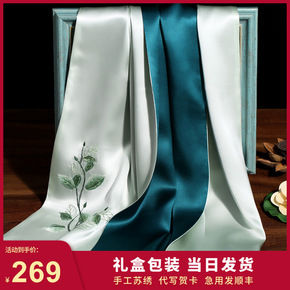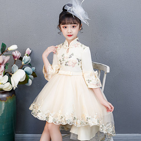 女童旗袍唐装秋拖尾网纱裙儿童表演连衣裙七分袖绣花公...