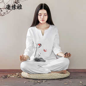 棉麻印花瑜伽服舒适宽松素食禅修服中式长袖户外透气运...