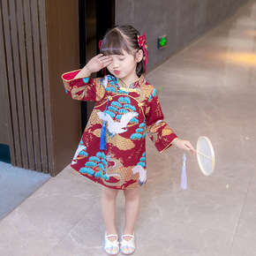 女童旗袍连衣裙2021新款秋装时尚中国风唐装仙鹤女...