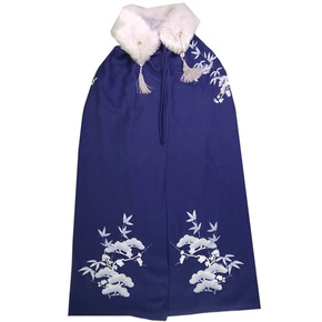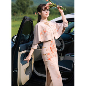麂皮绒印花套装旗袍少女民国风文艺复古大气斗篷式披肩...