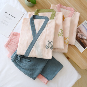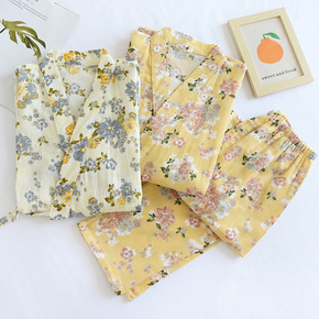 日式和服睡衣女春夏七分袖长裤家居服套装全棉纱布甚平...