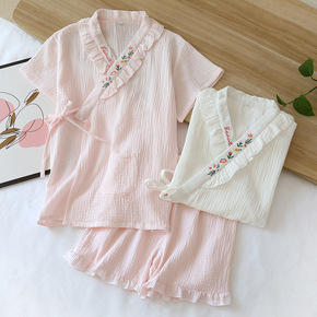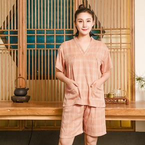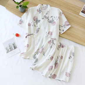日式纯棉双层纱布和服女睡衣夏薄款短袖短裤汗蒸服浴衣...