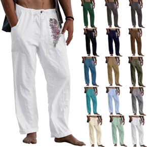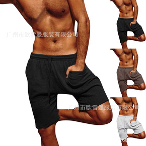 跨境 男士棉麻哈伦裤抽绳休闲七分裤轻盈宽松沙滩瑜伽...