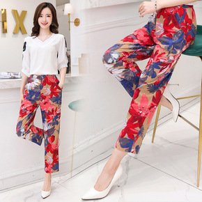 2021夏季沙滩女裤棉绸松紧腰直筒花裤大码印花九分...