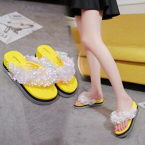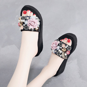 欧美珍珠花朵凉拖鞋 夏季报款创意厚底凉拖女 多款海...