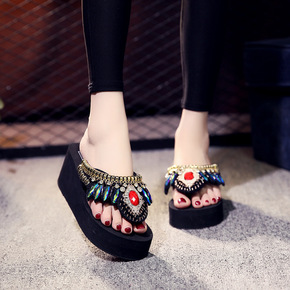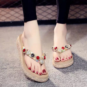 韩版高跟一字拖鞋女夏甜美花朵海边松糕沙滩拖鞋时尚坡...