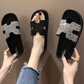 跨境2019夏季凉拖女休闲一字拖平底女拖鞋大码休闲...
